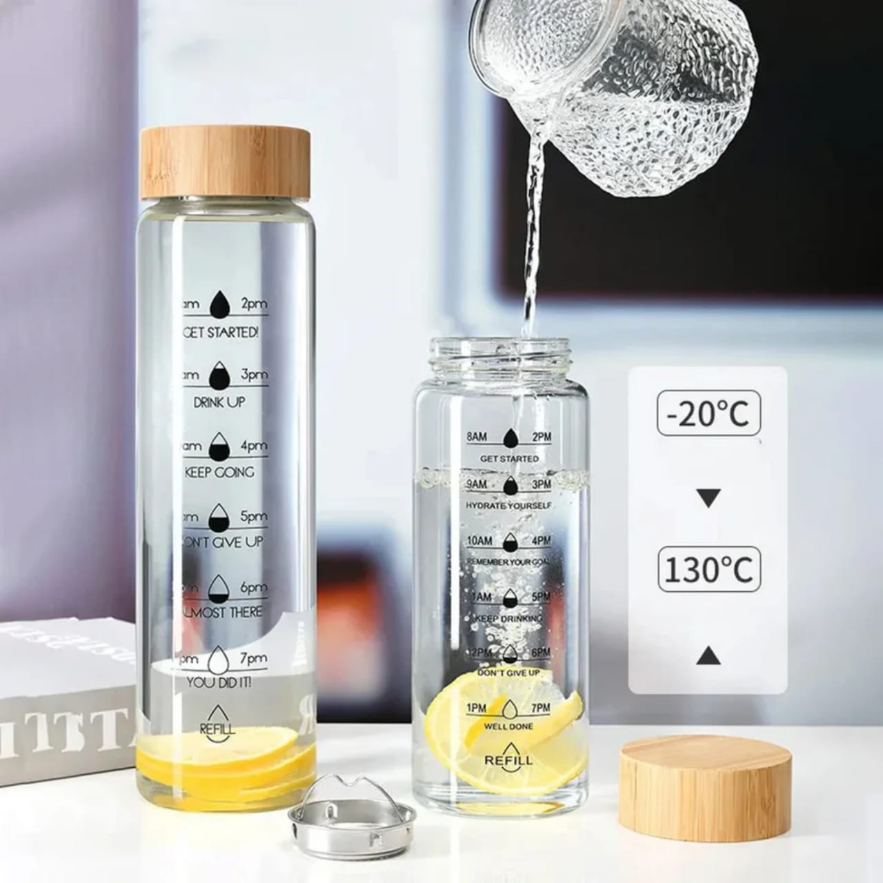 بطری پیرکس با درب چوبی پیچی تایمدار یک انتخاب شیک و کاربردی برای نگهداری انواع نوشیدنیهای سرد و گرم است که با طراحی خاص و کیفیت بالا توجه هر سلیقهای را جلب میکند. بدنه شفاف و مقاوم پیرکس این بطری امکان مشاهده محتویات را فراهم کرده و در برابر حرارت و ضربه دوام بالایی دارد. درب چوبی پیچی علاوه بر ظاهری لوکس، مانع نشت مایعات میشود و قابلیت تایمدار بودن آن به شما کمک میکند زمان مصرف نوشیدنی یا دمنوش را به راحتی مدیریت کنید. بطری پیرکس تایمدار با درب چوبی پیچی، گزینهای ایدهآل برای استفاده در منزل، محل کار یا حتی هدیه دادن است . دارای حجم 1 لیتر